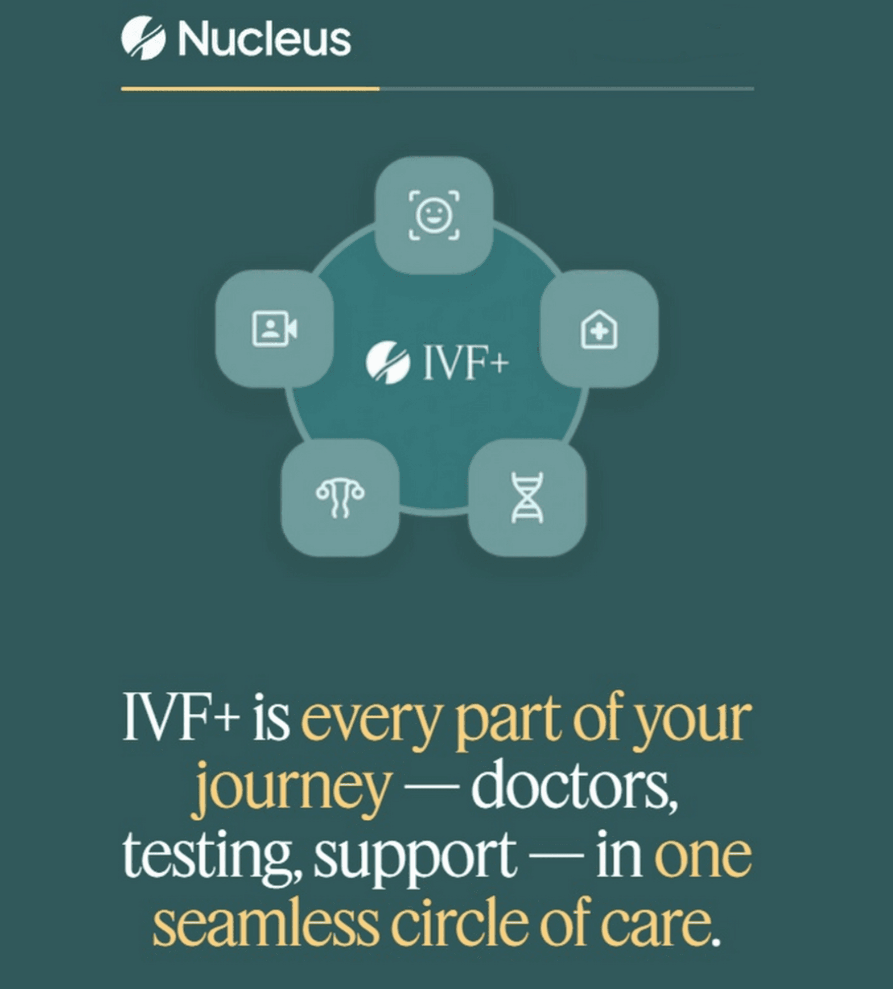 With Nucleus IVF+, your entire fertility journey is managed for you so you can focus better on becoming a parent. You don’t have to stress about scattered pricing and coordinating timelines with different experts. With Nucleus, you start with a transparent, single price point and get concierge-like assistance with everything from the IVF cycle and consultations to advanced genetic testing and embryo selection software. Explore the program here.
